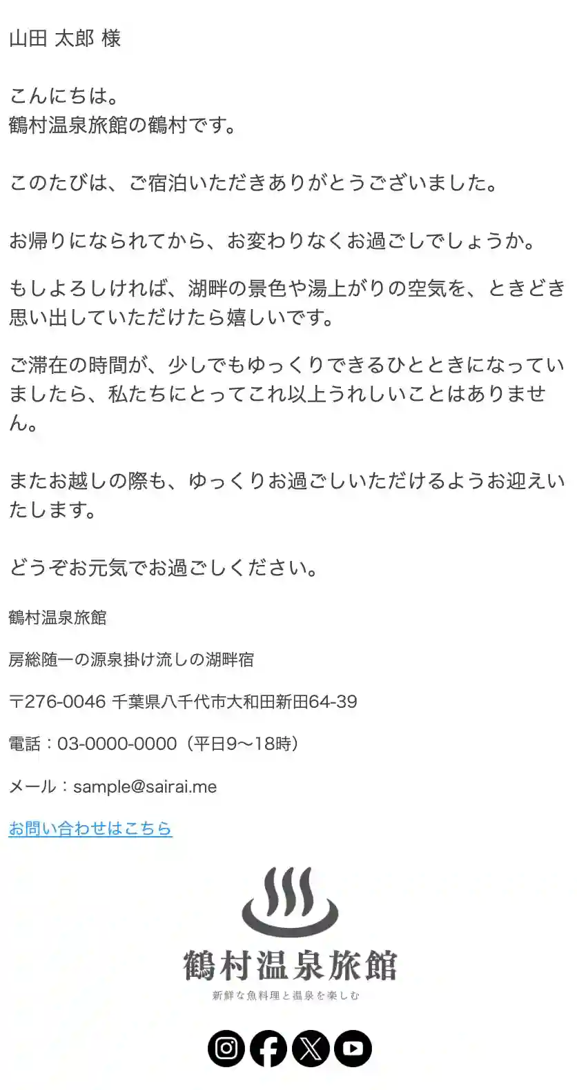 ご宿泊から数日後、感謝の気持ちをお届けします。旅の記憶が鮮明なうちに、自然な形で宿との繋がりを再認識していただきます。